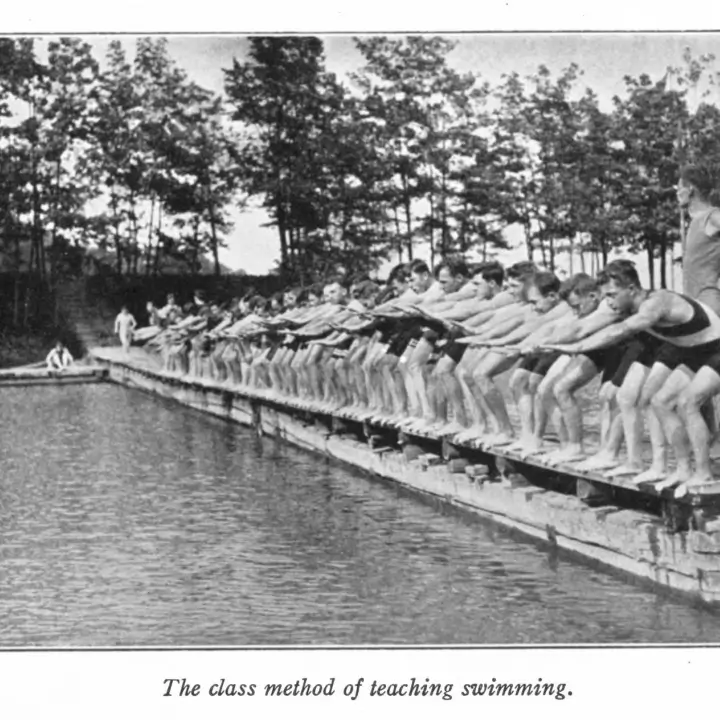 Answering a Y campaign “to teach every man and boy in North America” to swim, George Corsan comes to the Detroit YMCA to teach the skill using unique methods: group lessons and lessons on land as a confidence builder.